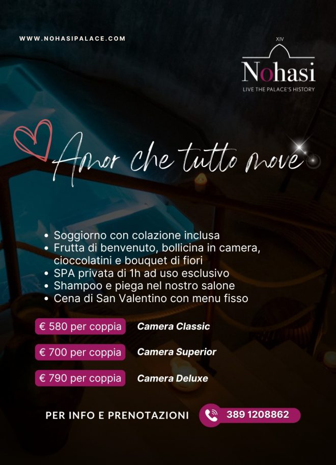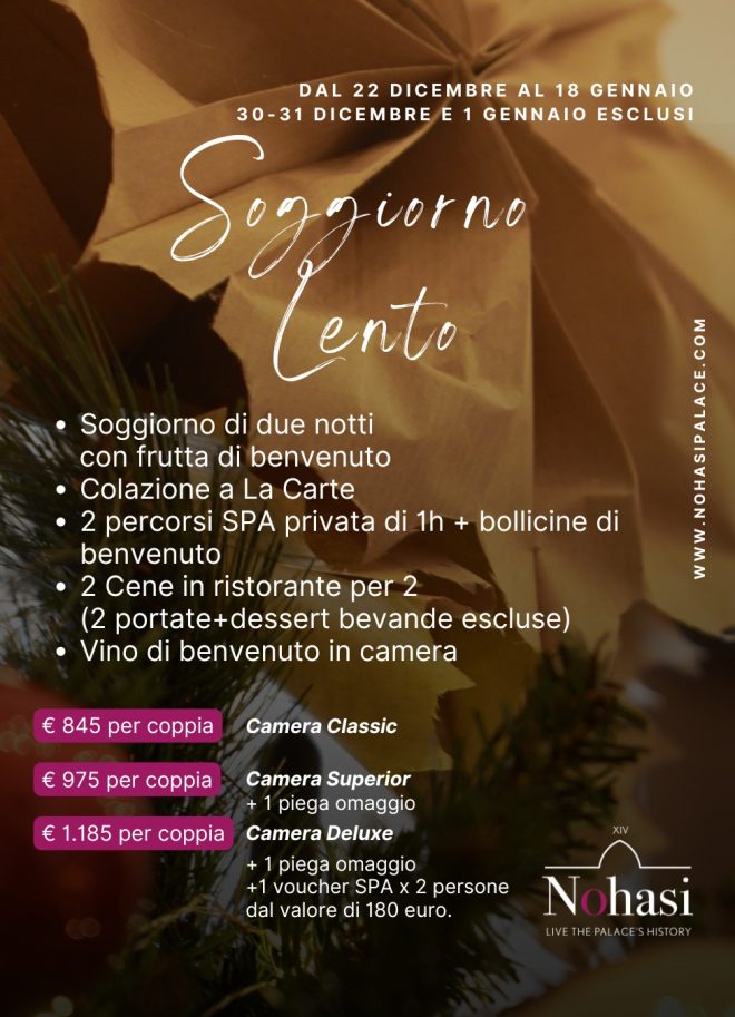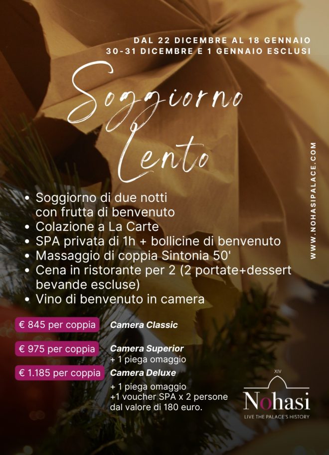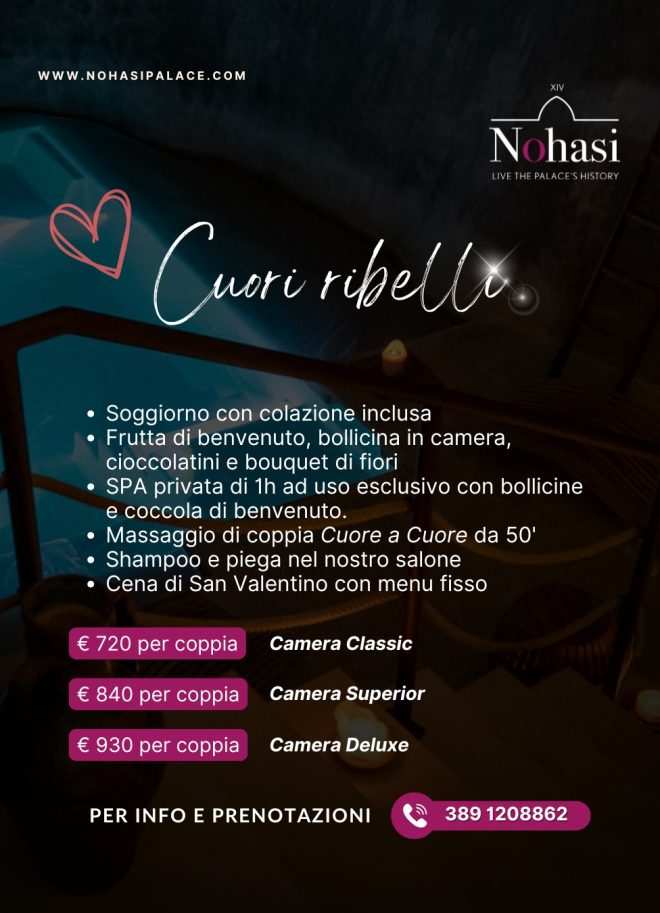 Quì e Ora puoi godere di momenti unici in Nohasi Palace Hotel dove il tempo si ferma solo per dare spazio al tuo benessere. Una preziosa dimora storica di eterna bellezza finemente ristrutturata, dove ambienti raffinati e intrisi di storia e tradizioni ti trasporteranno in un’altra dimensione: il passato e il futuro si annullano, conta solo il presente, il tuo #QuìeOra.